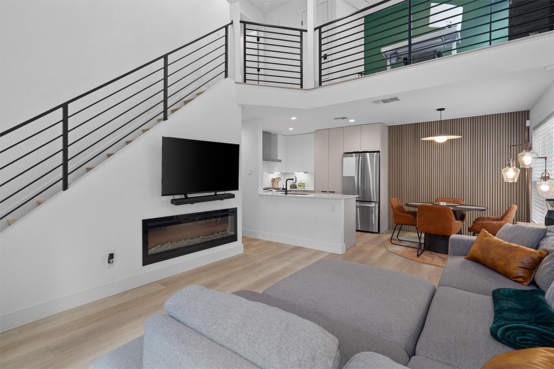 Rare private yard + 2 reserved parking spaces just minutes from The Domain?plus up to $15,000 toward a 3-2-1 rate buydown (or closing cost or however buyers deems fit) offered by the seller.This modern condo is positioned in one of Austins most convenient corridors, just minutes from The Domain, Q2 Stadium, major tech campuses, breweries, parks, and trail systems, with quick access to MoPac. Inside, a bright open layout is anchored by a sleek kitchen featuring quartz countertops, stainless steel appliances, a gas range, custom cabinetry, and a peninsula designed for both everyday living and entertaining. Vaulted ceilings and expansive windows fill the living area with natural light, complemented by contemporary lighting and a stylish electric fireplace.The main level includes a flexible guest bedroom, full bath, and laundry, while upstairs offers a spacious primary suite with dual vanities, backlit mirrors, two closets, and a walk-in shower, along with an open loft ideal for a home office or secondary living space. Sliding glass doors extend the living area to a private, fenced patio and yard?one of the larger outdoor spaces in the community?and are outfitted with a custom, voice-activated shade for added convenience. All windows feature custom blinds, enhancing both privacy and comfort throughout the home.With no carpet, move-in-ready condition, short-term rentals permitted, and strong long-term investment potential, this residence offers rare lifestyle flexibility and value in a highly sought-after Austin location.