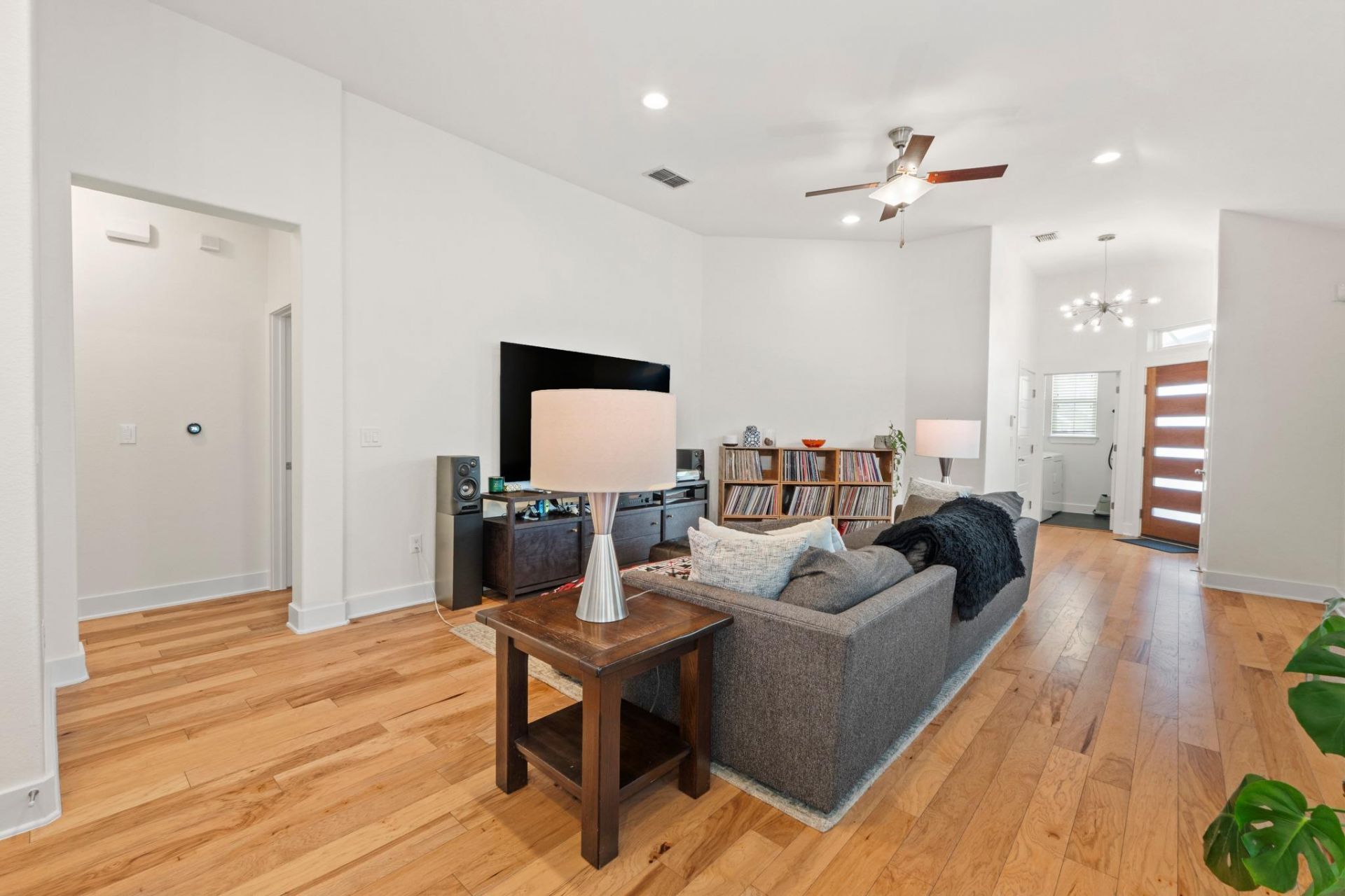 Modern single-level living designed for ease, style, and convenience in the gated community of Eastwood at Riverside. This thoughtfully designed home offers no interior or exterior steps, creating a highly functional layout ideal for buyers seeking accessibility, comfort, and effortless everyday living. The open-concept floor plan features soaring 12-foot ceilings, abundant natural light, and seamless flow between living, dining, and kitchen spaces.Recent exterior enhancements include composite decking and turf in the side and backyard, creating a polished, low-maintenance extension of the home that enhances indoor-outdoor living without the upkeep of traditional landscaping. Whether entertaining, relaxing, or traveling frequently, the outdoor spaces are designed to be enjoyed with minimal maintenance.Additional highlights include smart-home features, a two-car garage, and a lock-and-leave lifestyle rarely found this close to the city. Ideal for professionals, frequent travelers, downsizers, or anyone wanting newer construction near Downtown Austin and Austin-Bergstrom International Airport.Move-in ready and positioned for easy living in one of the areas most convenient locations.
