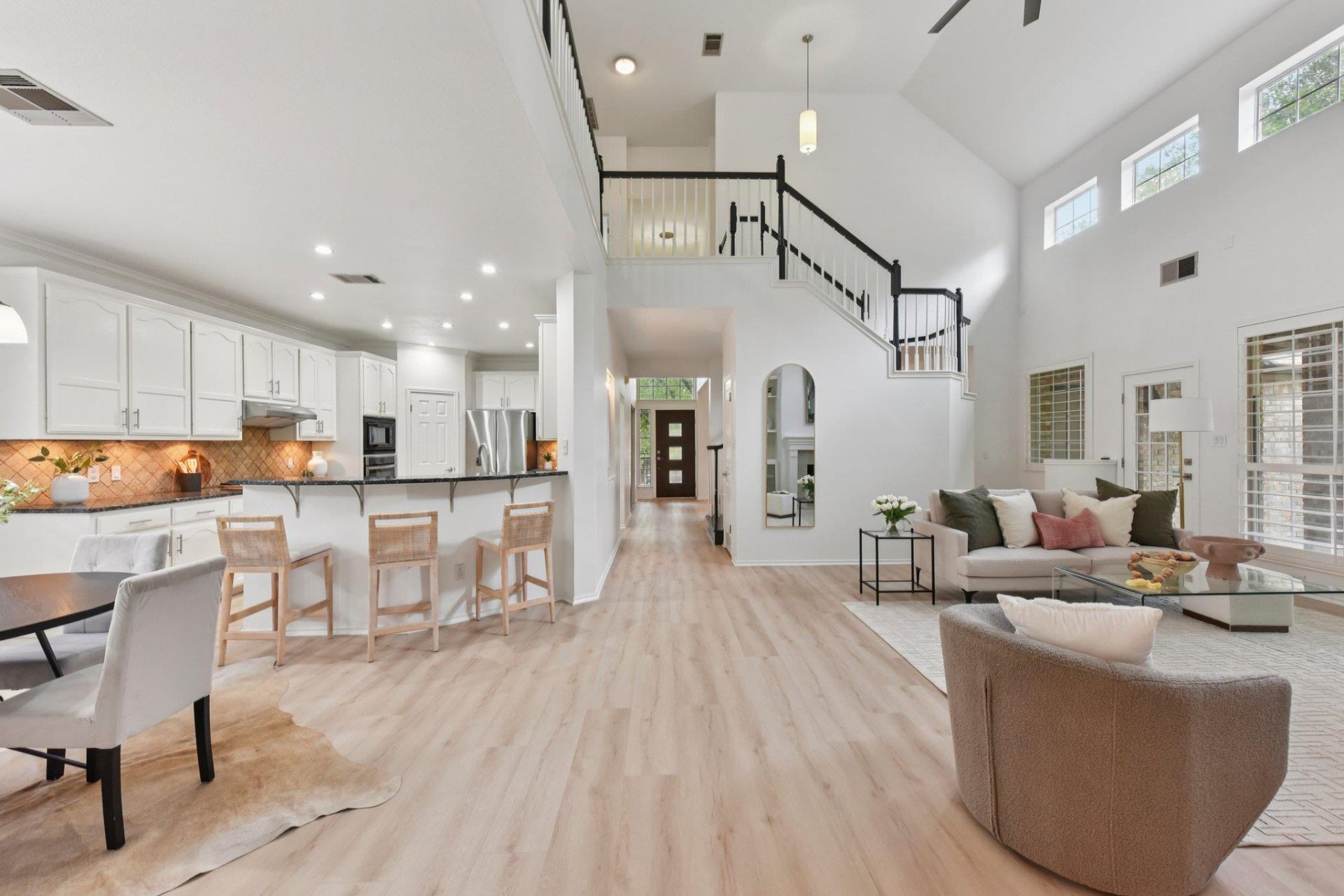 Rare opportunity on a flat, quiet cul-de-sac in the heart of Steiner Ranch. This beautifully updated home shines with new flooring, fresh interior paint, and professional designer landscaping. The functional and high-demand layout features a main-level dedicated office and formal dining room plus a soaring great room with floor-to-ceiling windows overlooking a lush private backyard. The chefs kitchen boasts granite countertops, 42-inch cabinets, stainless appliances, and a walk-in pantry. Perfectly designed for flexibility, the primary suite and a secondary bedroom with a full guest bath are both located on the main floor. Upstairs you will discover two additional bedrooms with walk-in closets and a massive loft ideal for a second living area or playroom. The outdoor oasis features a large covered patio with an additional stone dining area shaded by mature trees, plus ample room to add a garden or playscape. Residents enjoy world-class amenities including top-rated schools, multiple swimming pools, well-maintained tennis courts, vibrant playgrounds, spacious clubhouses, and exclusive Steiner Ranch lake access. This home offers a perfect blend of custom detail and community lifestyle!
